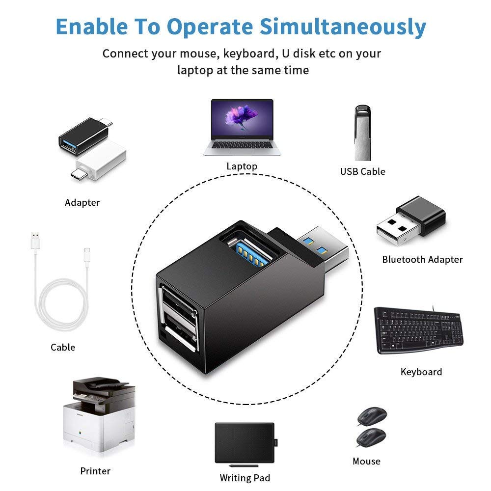 The USB 2.0 mini hub could read and write on three products at the same time to keep you away from the hassle of constant unplugging and re-plugging.
